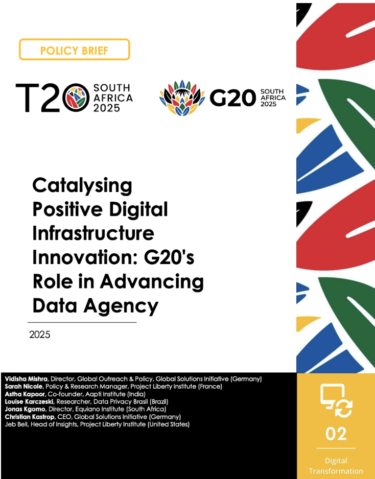 Co-written with the Global Solutions Initiative, the Aapti Institute, Data Privacy Brasil, and the Equiano Institute, the policy brief “Catalysing Positive Digital Infrastructure Innovation: G20’s Role in Advancing Data Agency” feeds directly into the T20 Communiqué, a collection of high-impact recommendations for the G20 by the task forces, published during the T20 summit.